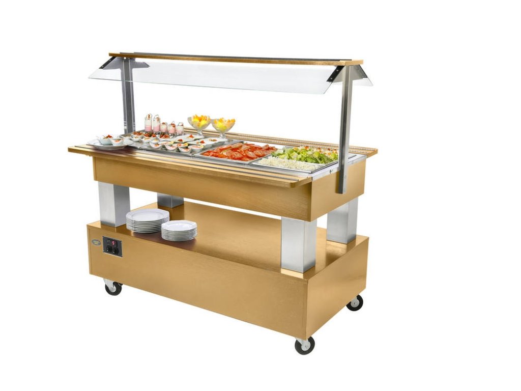 Bar je určený pre štyri gastronádoby GN 1/1 s hĺbkou 150 mm. V hornej časti sa nachádza LED osvetlenie so sklenenou clonou, ktorá chráni potraviny a zároveň ich atraktívne prezentuje. Teplotu je možné nastaviť v rozsahu od +2 °C do +10 °C, čím sa zabezpečí optimálne chladenie a čerstvosť jedál. Bar je dostupný v troch farebných prevedeniach: tmavohnedá, svetlohnedá alebo biela. Mobilita je zabezpečená kvalitnými kolieskami, ktoré umožňujú ľahké premiestnenie.