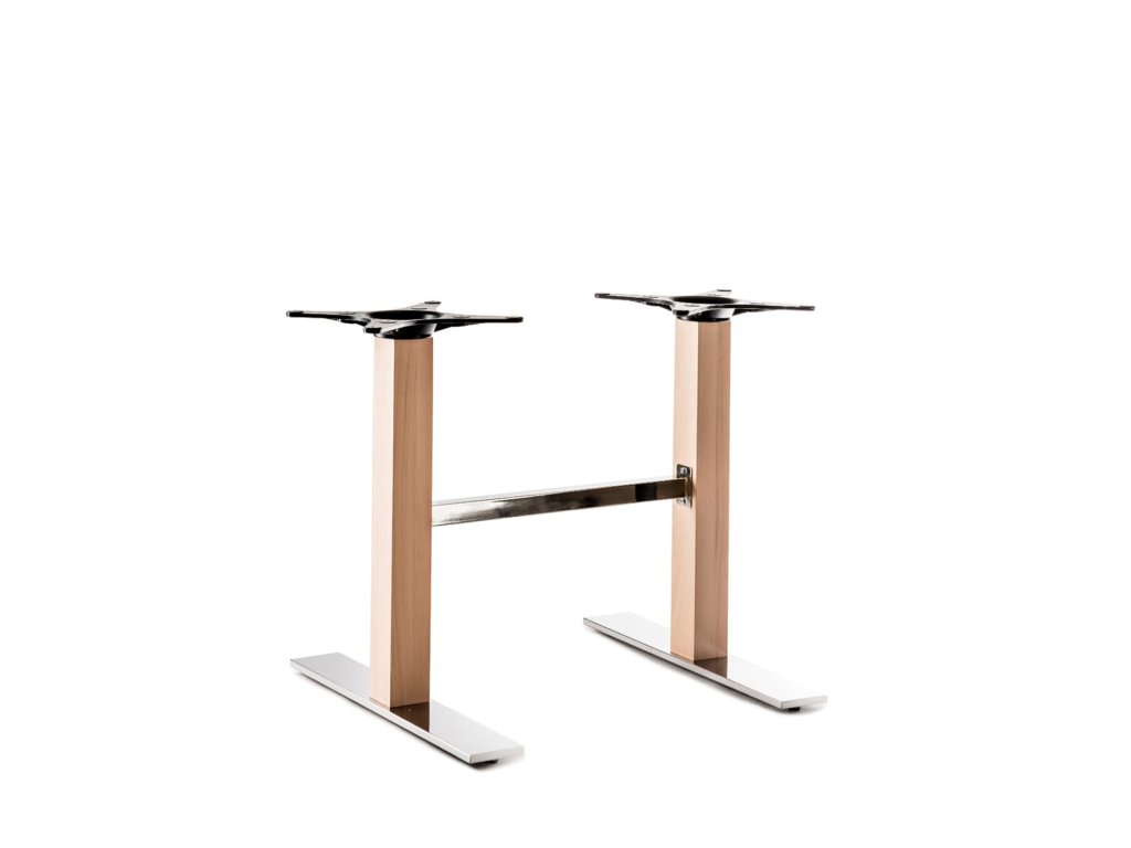 Podnož kombinuje odolnosť nehrdzavejúcej ocele s teplým vzhľadom dreva. Dvojitá základňa s rozmermi 2 x 720 x 110 mm z leštenej nehrdzavejúcej ocele zaisťuje maximálnu stabilitu. Štvorcový stĺpik s rozmermi 85x85 mm je vyrobený z dreva a je doplnený o kryt z nehrdzavejúcej ocele, čo vytvára harmonický a moderný celok. Výška podnože je 720 mm, štandardná pre jedálenské stoly.