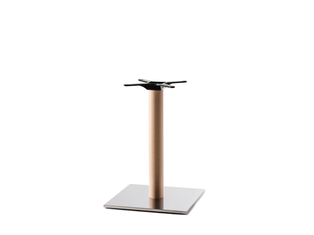 Podnož disponuje pevnou štvorcovou základňou s rozmermi 500x500 mm, ktorá zaisťuje maximálnu stabilitu. Stĺpik s priemerom Ø90 mm je vyrobený z kvalitného dreva, zatiaľ čo kryt základne a stĺpika sú z vysoko kvalitnej leštenej nehrdzavejúcej ocele. Táto kombinácia materiálov nielenže pôsobí luxusne, ale zároveň zaručuje dlhodobú odolnosť voči korózii a bežnému opotrebeniu v komerčnom prostredí. Celková výška podnože je 720 mm, čo je štandardná výška pre jedálenské stoly.