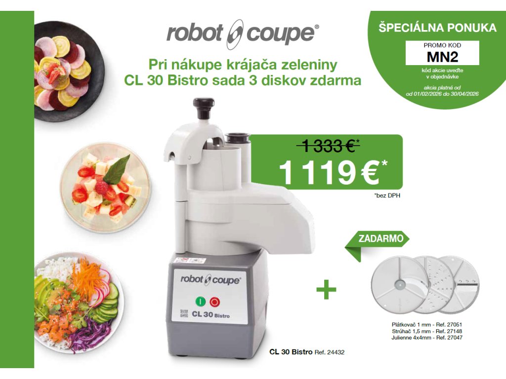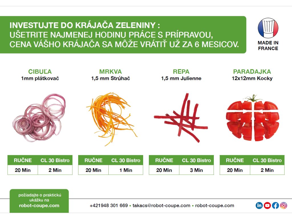 Krájač zeleniny CL30 Bistro je spoľahlivé profesionálne gastro vybavenie, určené pre malé prevádzky ako sú bistrá, bufety a reštaurácie, s dennou kapacitou 20 až 80 porcií. Tento model je navrhnutý na efektívne spracovanie širokej škály surovín, vrátane krájania na plátky, strúhania ovocia, zeleniny, syra, strúhanky či čokolády. Umožňuje tiež precízne krájanie na kocky a hranolky.