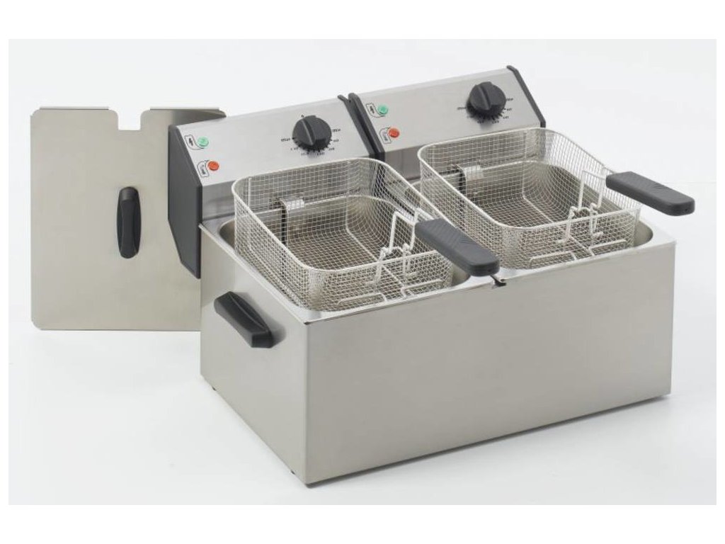 Fritéza je určená na umiestnenie na pracovnú dosku a pripája sa do štandardnej elektrickej zásuvky. Pravidelné čistenie nádob, košíkov a výhrevných telies je kľúčové pre udržanie optimálneho výkonu a hygieny.