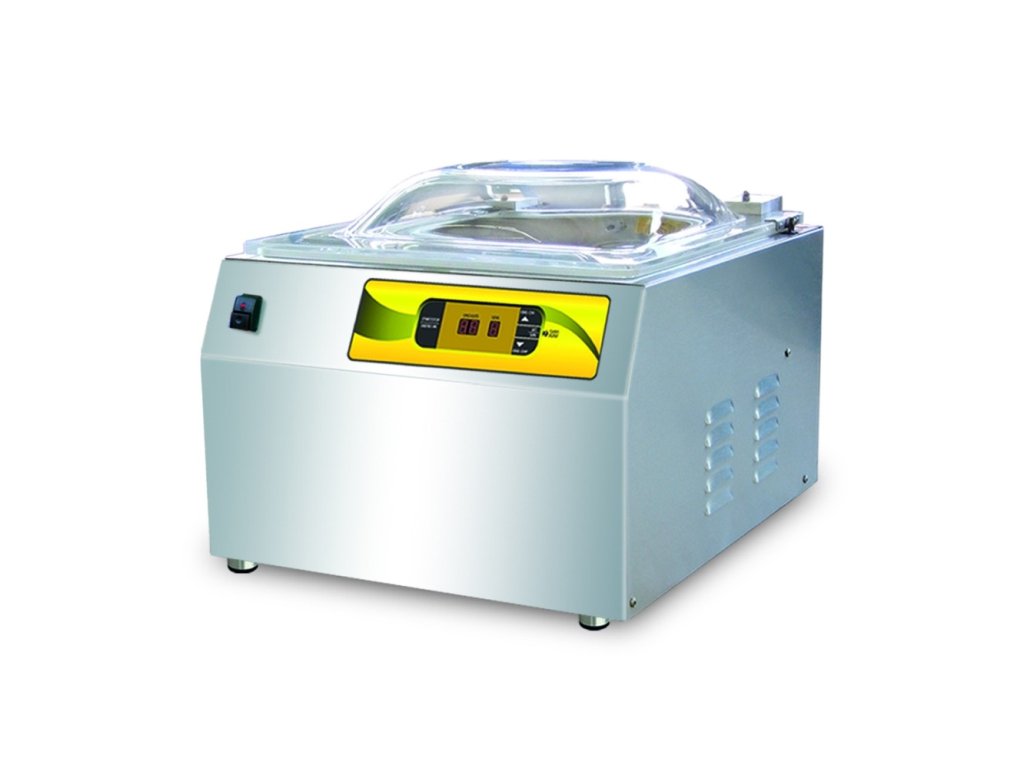 S výkonom pumpy 16 m?/hod a dĺžkou zvarovacej lišty 450 mm je tento stroj ideálny pre prevádzky s vyšším objemom balenia. Digitálny ovládací panel umožňuje jednoduché nastavenie vákuovania a zvárania, zatiaľ čo zaoblené rohy komory uľahčujú čistenie a údržbu.