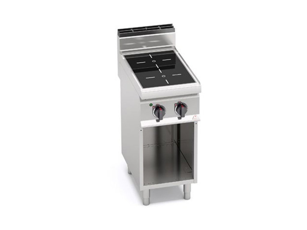 Tento sporák je vybavený dvoma vysoko výkonnými indukčnými zónami s rozmermi 230 x 230 mm, ktoré umožňujú rýchly ohrev a presnú reguláciu teploty. Indukčná technológia zaisťuje, že teplo sa generuje priamo v nádobe, čo minimalizuje tepelné straty a zvyšuje bezpečnosť. Sporák pracuje s prípojkou 2 x 3,5 kW pri napätí 400 V, čo zaručuje dostatočný výkon pre akúkoľvek gastronomickú prevádzku. Súčasťou je praktický otvorený podstavec, ktorý poskytuje dodatočný úložný priestor.