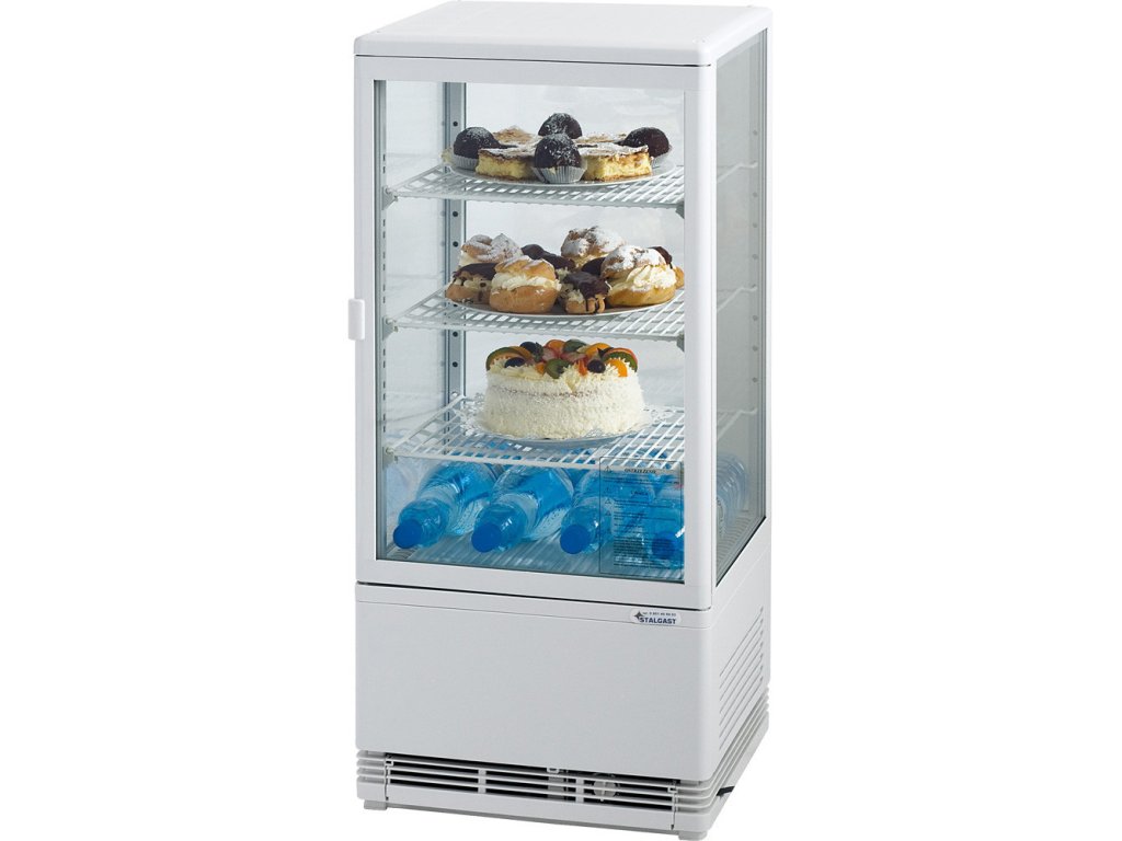Táto biela chladiaca vitrína s objemom 78 litrov je navrhnutá pre efektívnu prezentáciu produktov v menších prevádzkach alebo ako doplnkové chladiace zariadenie. Vďaka preskleným stenám zo všetkých strán a integrovanému osvetleniu sú vaše zákusky, nápoje alebo iné pochutiny vždy v centre pozornosti. Je ideálnym doplnkom pre kaviarne, bistrá, malé reštaurácie alebo predajné pulty.
